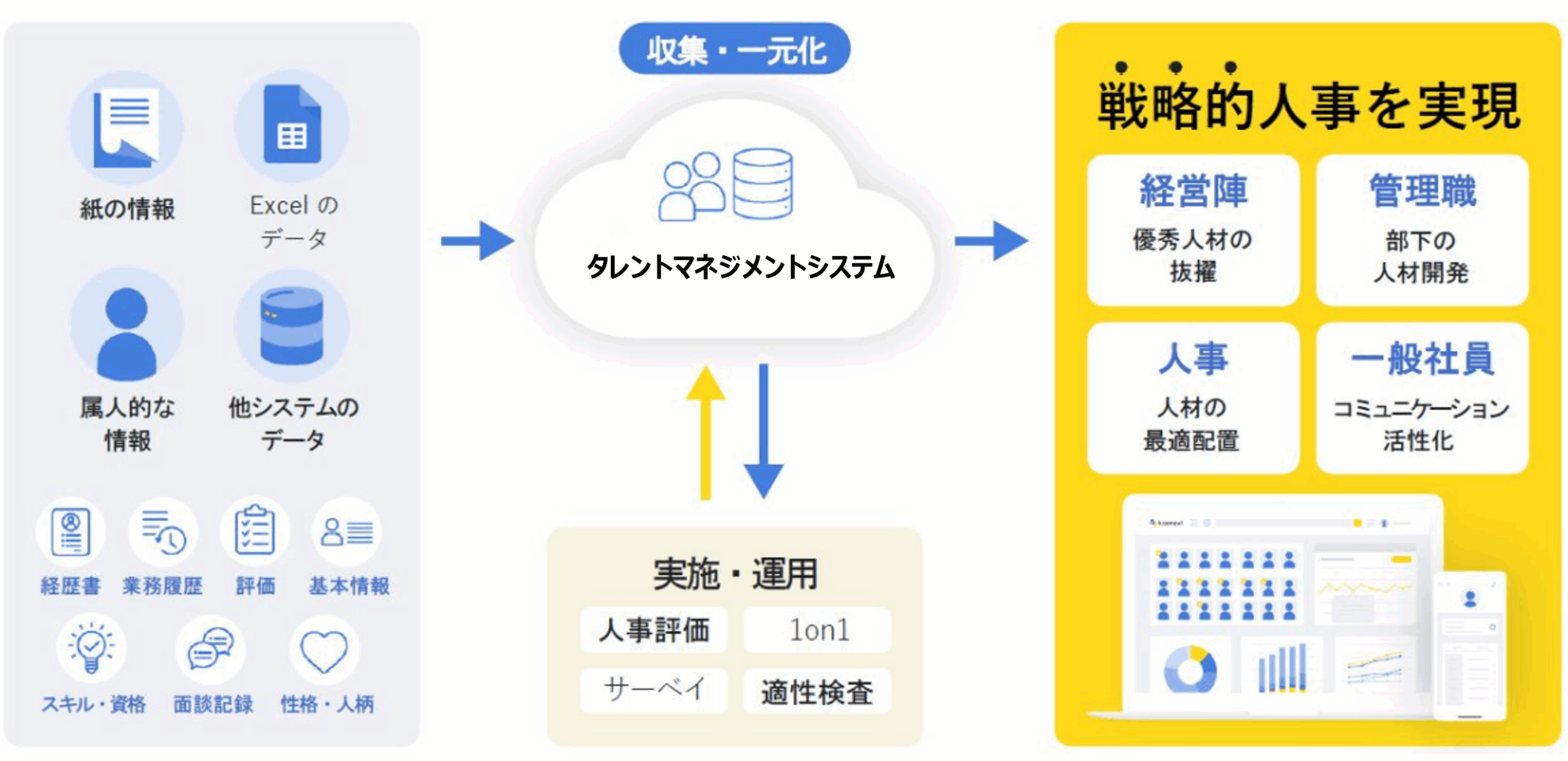 タレントマネジメントシステム(以下、TMSという)は、社内人材一人ひとりの情報(能力、スキル、資質、経験、実績、志向など)を効率的に収集し、一元的に管理・共有できるデータベース機能に加え、人材情報の可視化・分析を容易し、タレントマネジメントの効果を最大化させるシステムのことです。