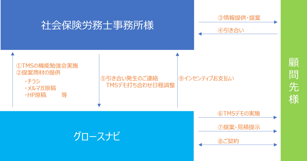 グロースナビでは社会保険労務士の皆さんと一緒に顧問先のTMS導入・活用の支援とソリューションの提供を行います。